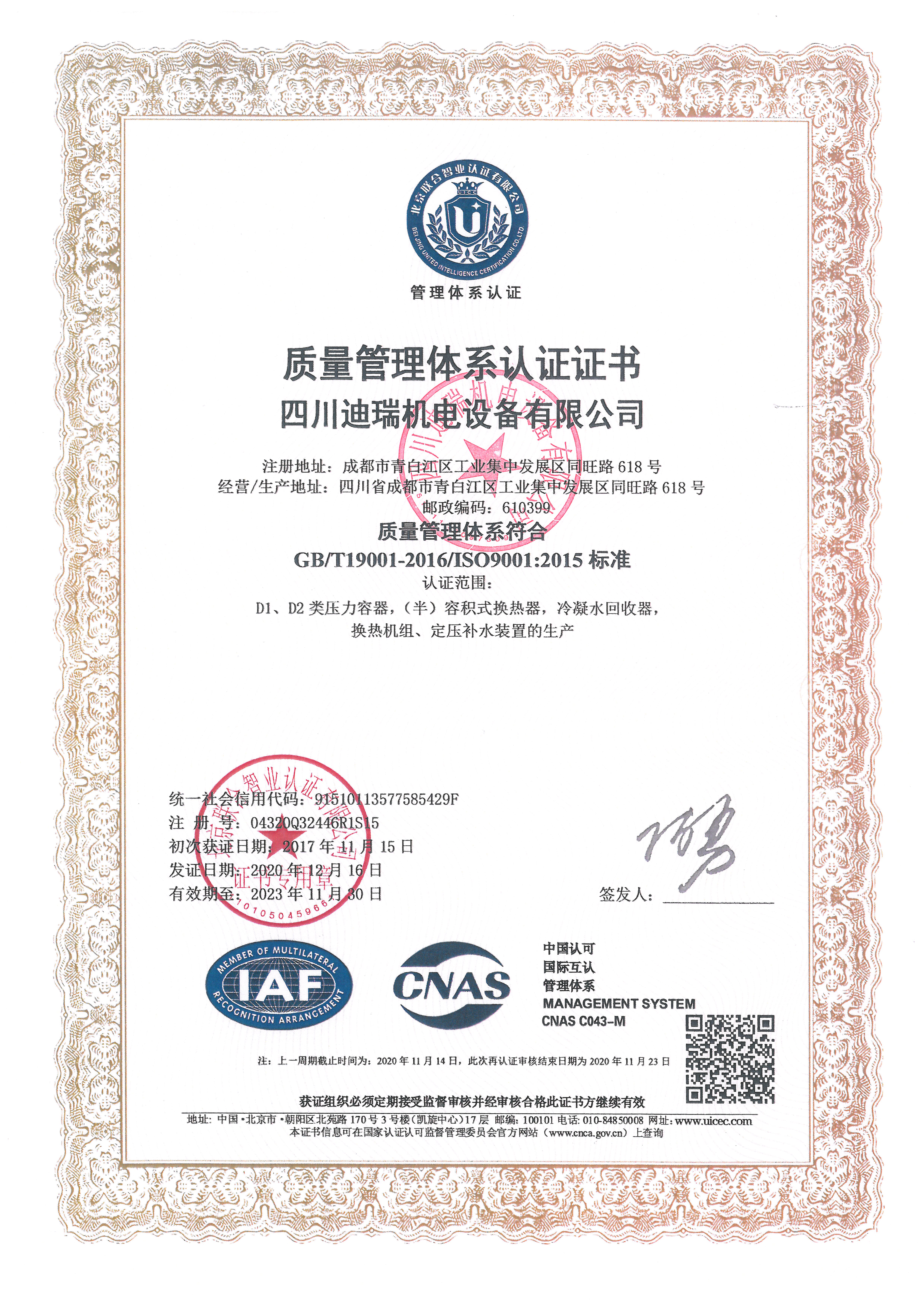 企業奉行“用戶至上、優質服務、持續改進”的宗旨,不斷改進產品結構,提升產品性能,并與西安交通大學能源與動力工程學院建立產學研合作,取得8項實用新型專利,正在申報一項發明專利。企業通過D1、D2類壓力容器制造許可認證和ISO9001質量管理體系認證,被評為成都市擬上規企業、成都市專特新精企業和大中華區酒店工程師協會最佳合作單位。